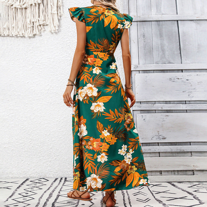 Our Alarica Floral Wrap Maxi Dress offers the perfect blend of elegance and comfort for your warm-weather wardrobe. This wrap-style design features a plunging V-neckline and flutter sleeves, providing a graceful, feminine look. The tie waist ensures a secure and adjustable fit, while the full-length skirt with a high slit adds a touch of drama and freedom of movement. Crafted from lightweight, breathable fabric, this dress is ideal for tropical getaways, casual outings, or summer events. Pair it with sandals and a woven bag for an effortlessly chic ensemble.