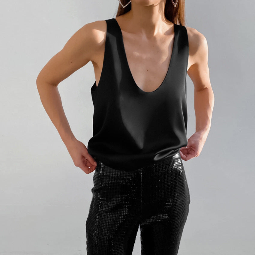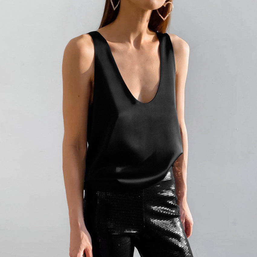 Our Billy satin tank top offers a perfect balance of sophistication and ease. Designed with a loose fit and a deep scoop neckline, it effortlessly combines elegance with a modern touch. The silky satin fabric drapes beautifully, making it a versatile addition to your wardrobe. Pair it with tailored trousers for a polished office look, or dress it down with jeans for a chic casual outfit.