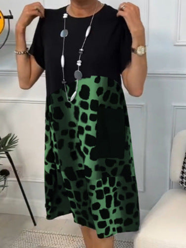 Our dress combines a stylish midi length with a relaxed fit, making it perfect for casual outings or everyday wear. The short sleeves enhance comfort, while the eye-catching color-blocked design features a bold print that adds a touch of personality. With a functional front pocket, this dress is as practical as it is fashionable. Crafted from soft, stretchy fabric, it ensures comfort throughout the day, while the crew neckline adds a classic touch. Embrace effortless style and versatility with this chic addition to your wardrobe.