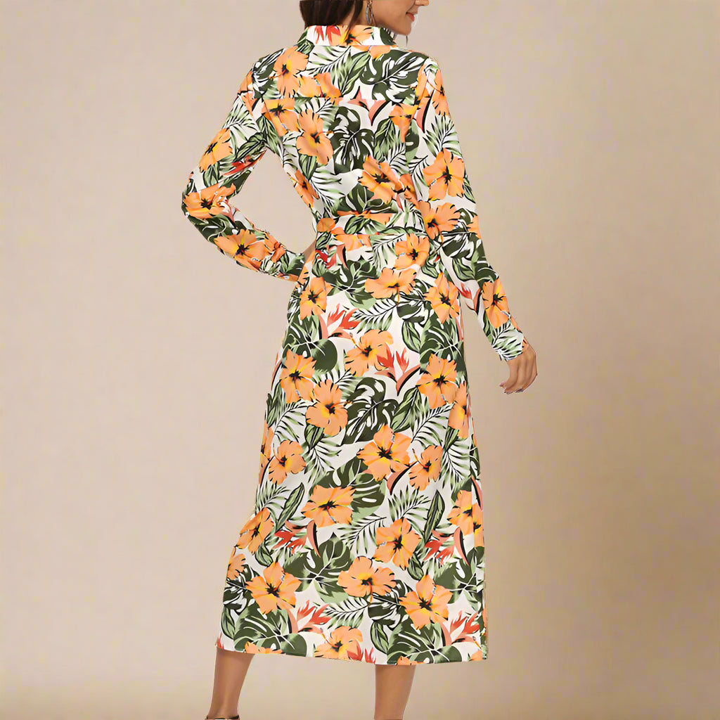 • Design: Button-down silhouette with a matching waist tie for a flattering fit.