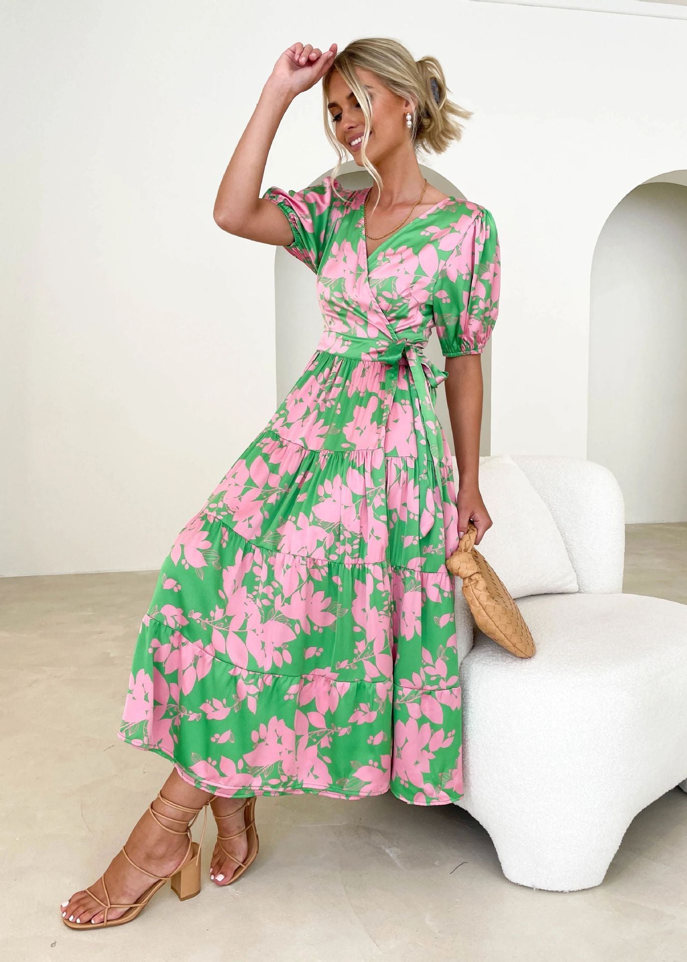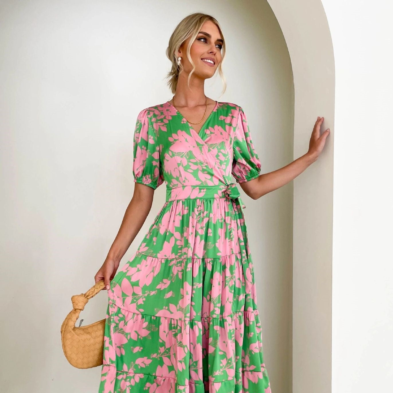 Florvera - Women's Wrap Midi Dress with Puff Sleeves
