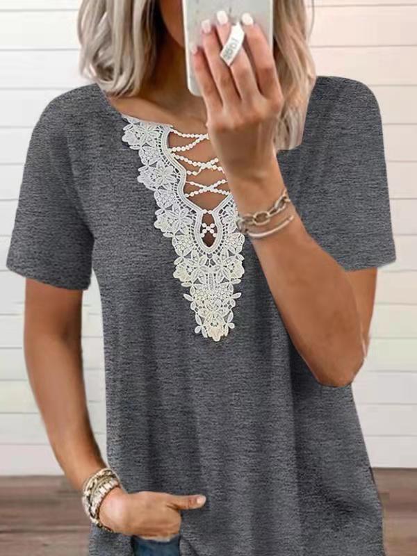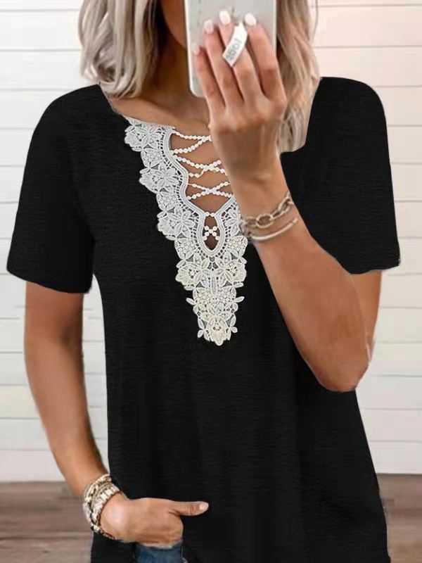 • Neckline: Feminine V-neck with intricate lace embellishment.