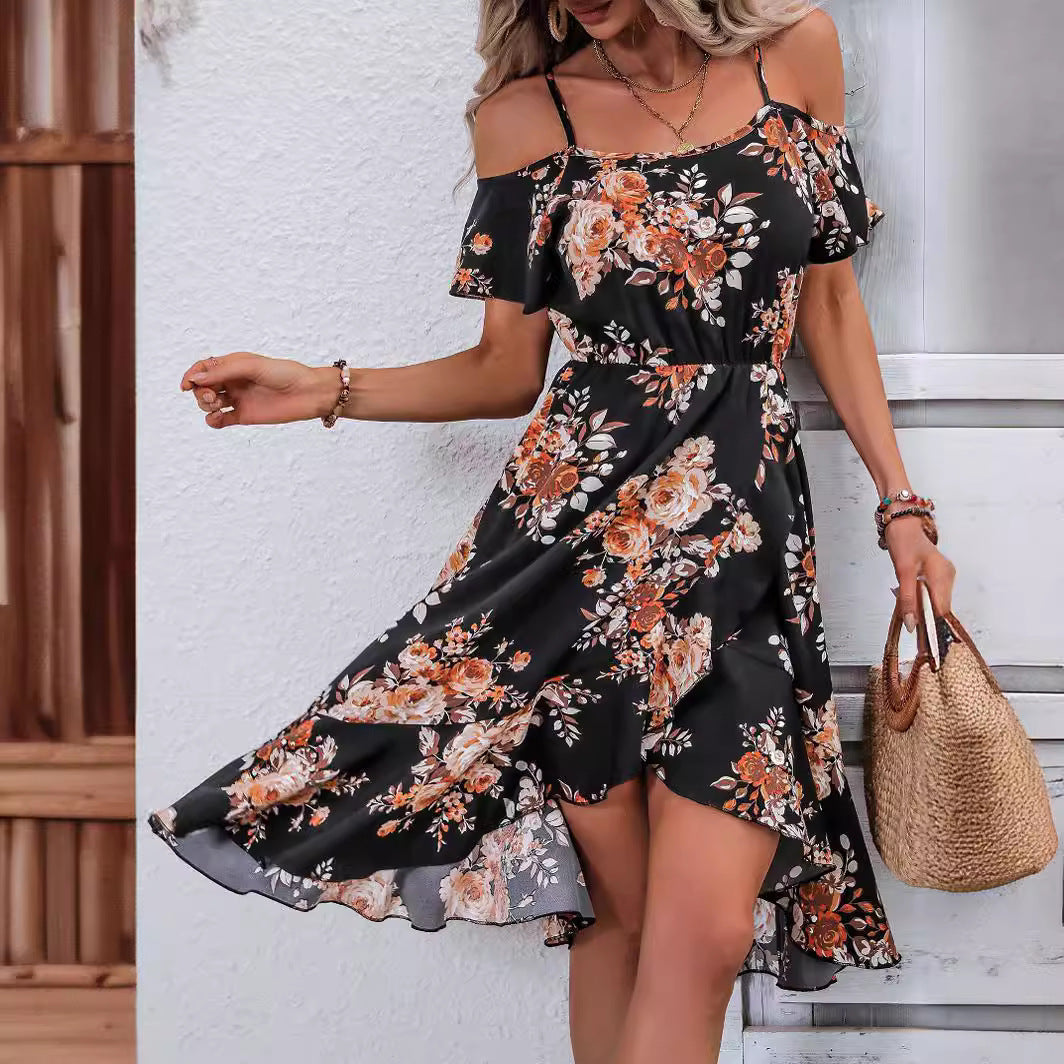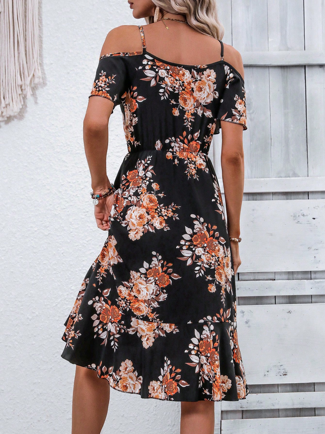 The LUVANA Breezy Off-Shoulder Floral Midi Dress is a perfect blend of elegance and effortless charm. Designed with delicate off-shoulder ruffle sleeves and adjustable spaghetti straps, this dress provides both comfort and style. The cinched waist enhances your silhouette, while the flowy A-line cut ensures graceful movement with every step. Featuring a high-low hemline, it adds a touch of sophistication, making it ideal for brunches, garden parties, or casual evenings out. The timeless floral print on a dark base creates a striking contrast, exuding femininity and grace.