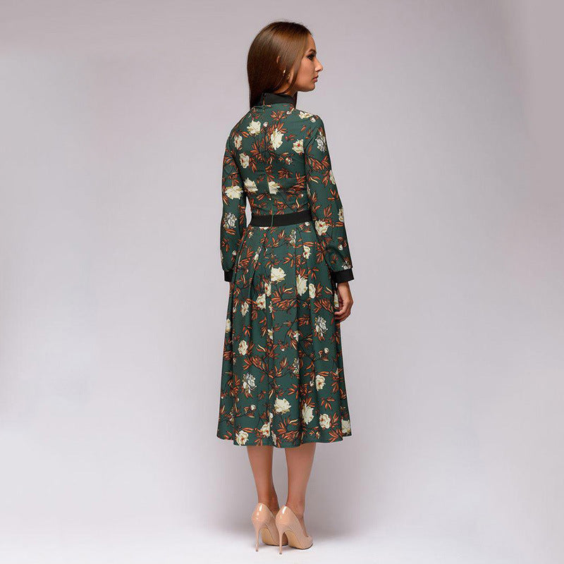 The MARVENA Elegant High-Neck Floral Midi Dress blends timeless sophistication with modern femininity. Designed with a structured high neckline and contrasting trim details, this dress exudes elegance for formal occasions or evening wear. The fitted bodice enhances the waist, while the full A-line skirt ensures a graceful, flowing silhouette. Long sleeves with tailored cuffs add a refined touch, making this dress a versatile choice for cool-weather styling. The rich floral pattern on a dark background creates a striking contrast, perfect for a statement look with minimal effort.