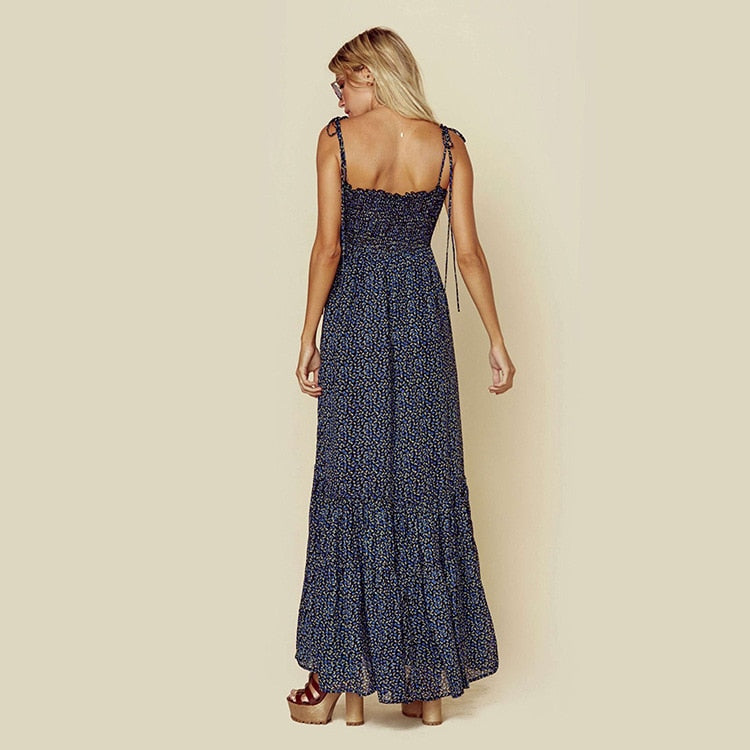 Step into bohemian elegance with the Midnight Bloom Women's Floral Smocked Maxi Dress. Featuring a delicate floral print and a smocked bodice for a flattering fit, this dress embodies comfort and charm. Adjustable tie-up straps add a touch of versatility, while the tiered hem enhances its flowy silhouette. Whether paired with sandals for a daytime look or styled with heels for an evening outing, this maxi dress is a versatile addition to your wardrobe.