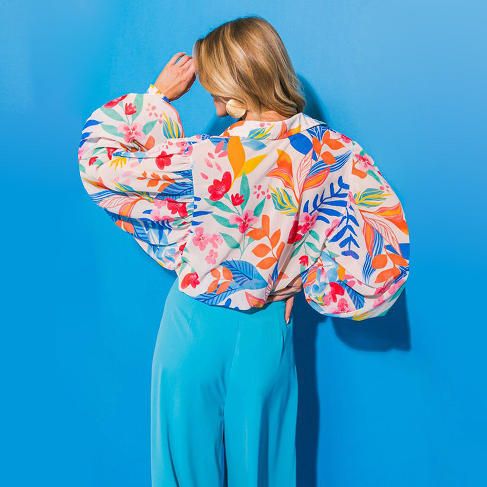 Add a splash of color to your wardrobe with the Solvia Romantic Women's  Flowing Sleeve Blouse. Designed for a bold yet elegant look, this blouse features a striking tropical print on a breezy chiffon fabric that flows effortlessly with movement. The voluminous statement sleeves create a dramatic touch, while the relaxed fit ensures comfort throughout the day. Whether paired with tailored trousers for a sophisticated ensemble or worn with casual denim for a laid-back vibe, this blouse is a standout choice for any occasion.