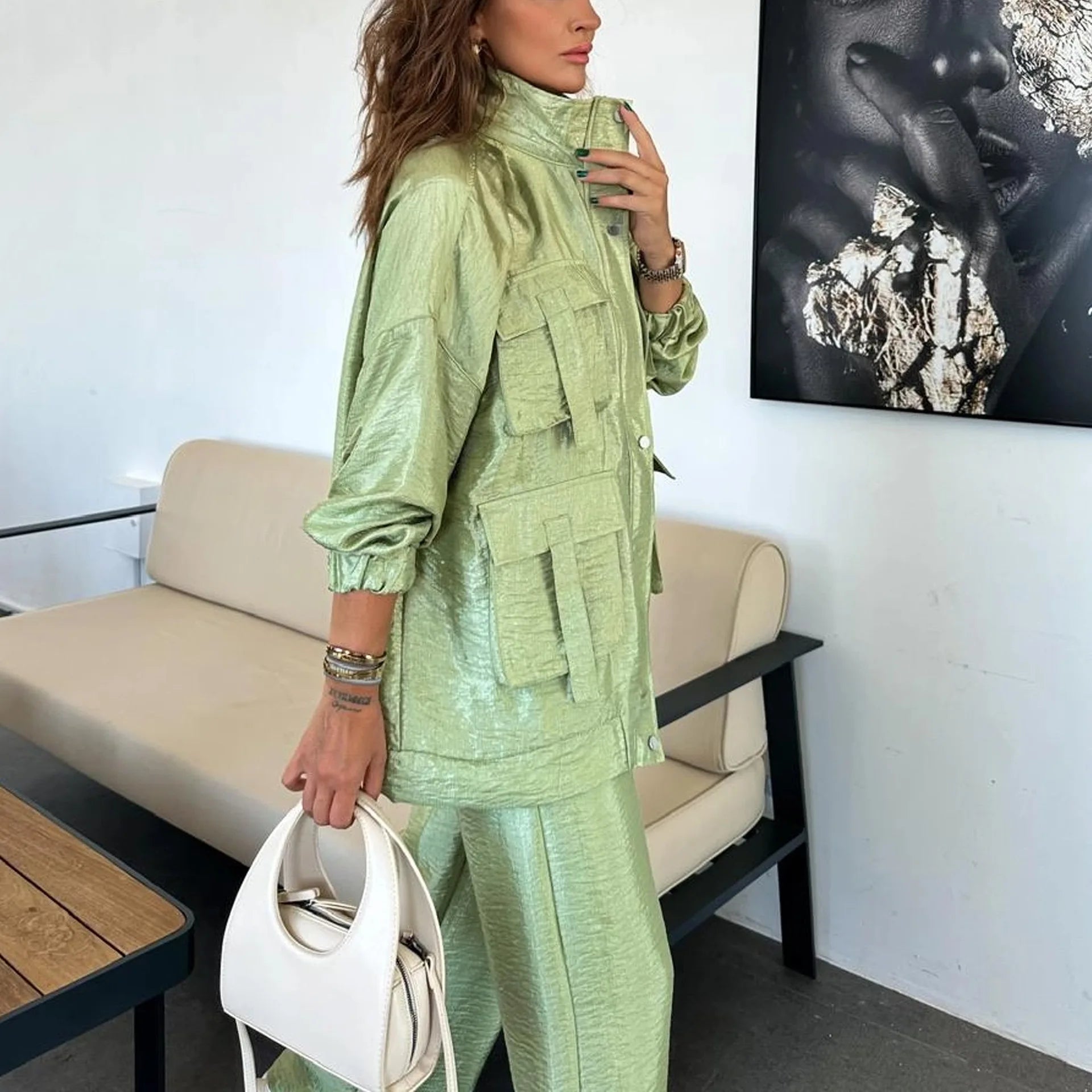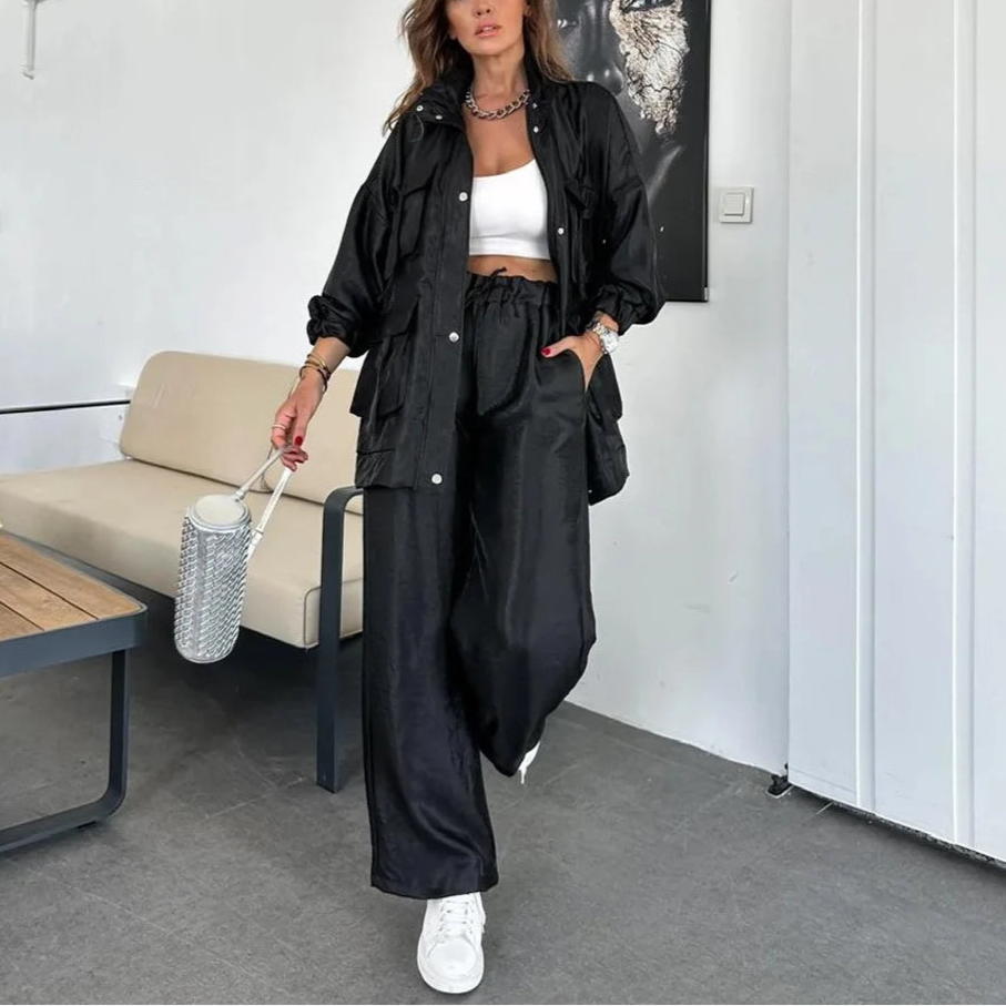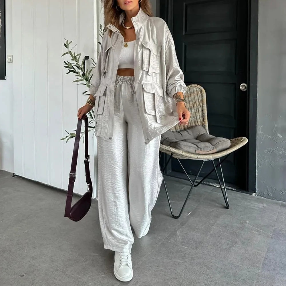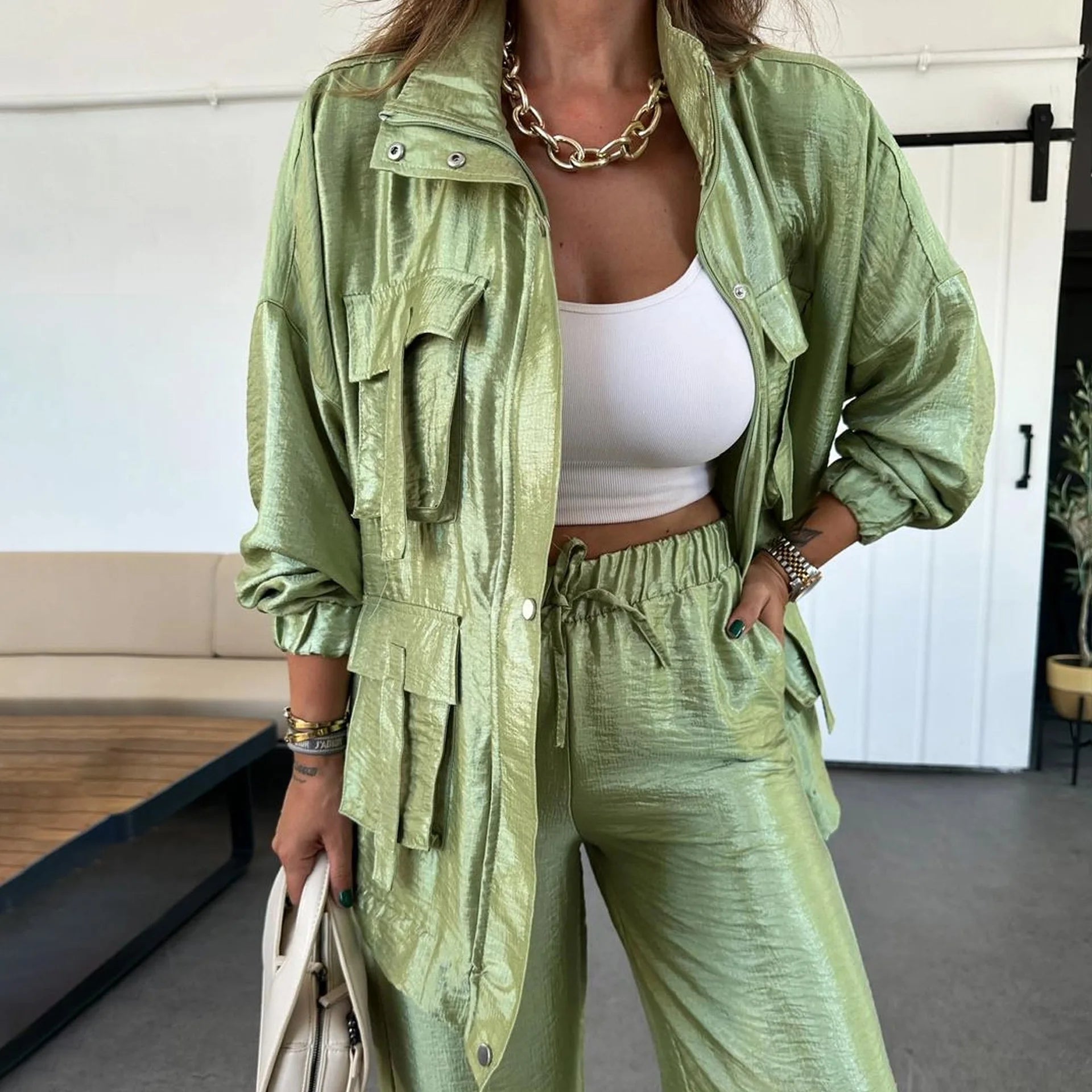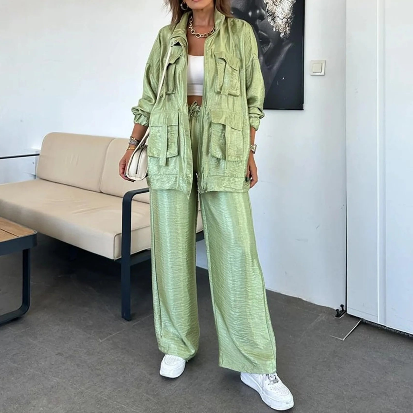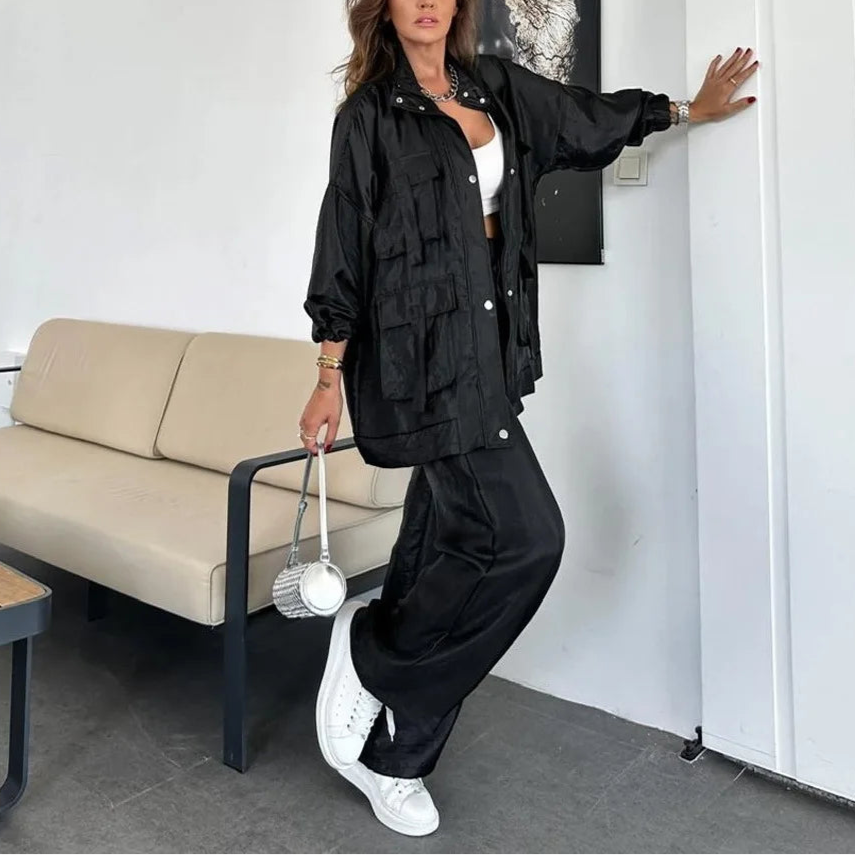 The Sorella™ Stylish Cargo Set is the ultimate blend of practical utility and modern elegance, designed to make you feel effortlessly stylish. The lightweight fabric drapes beautifully, offering a smooth, breathable feel that keeps you comfortable throughout the day. The cargo-style jacket features multiple oversized pockets, adding both a fashionable and functional element to your outfit, while the wide-leg trousers provide a relaxed yet polished look.