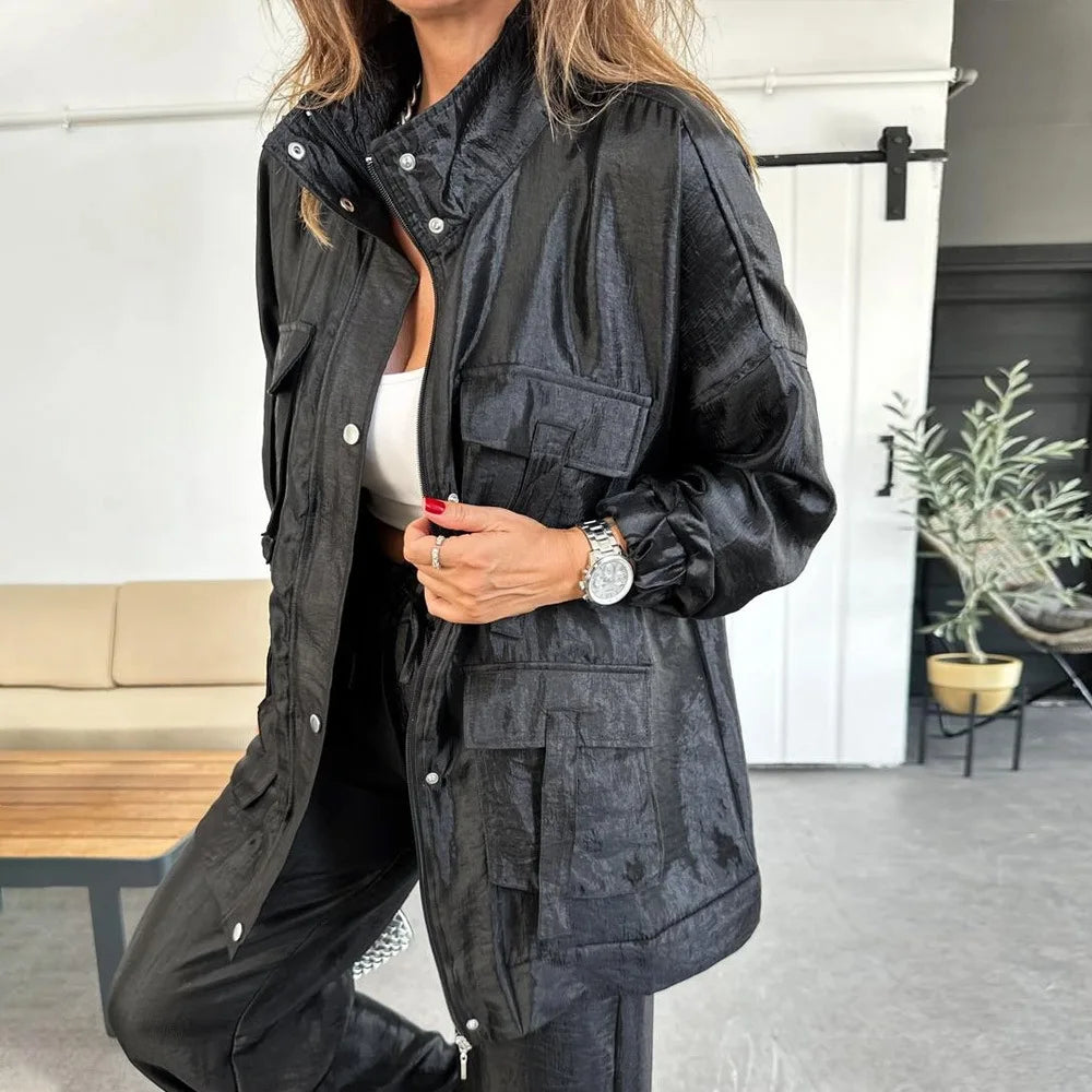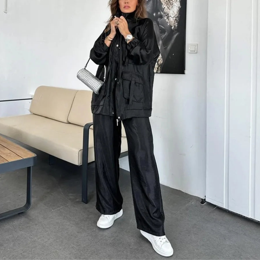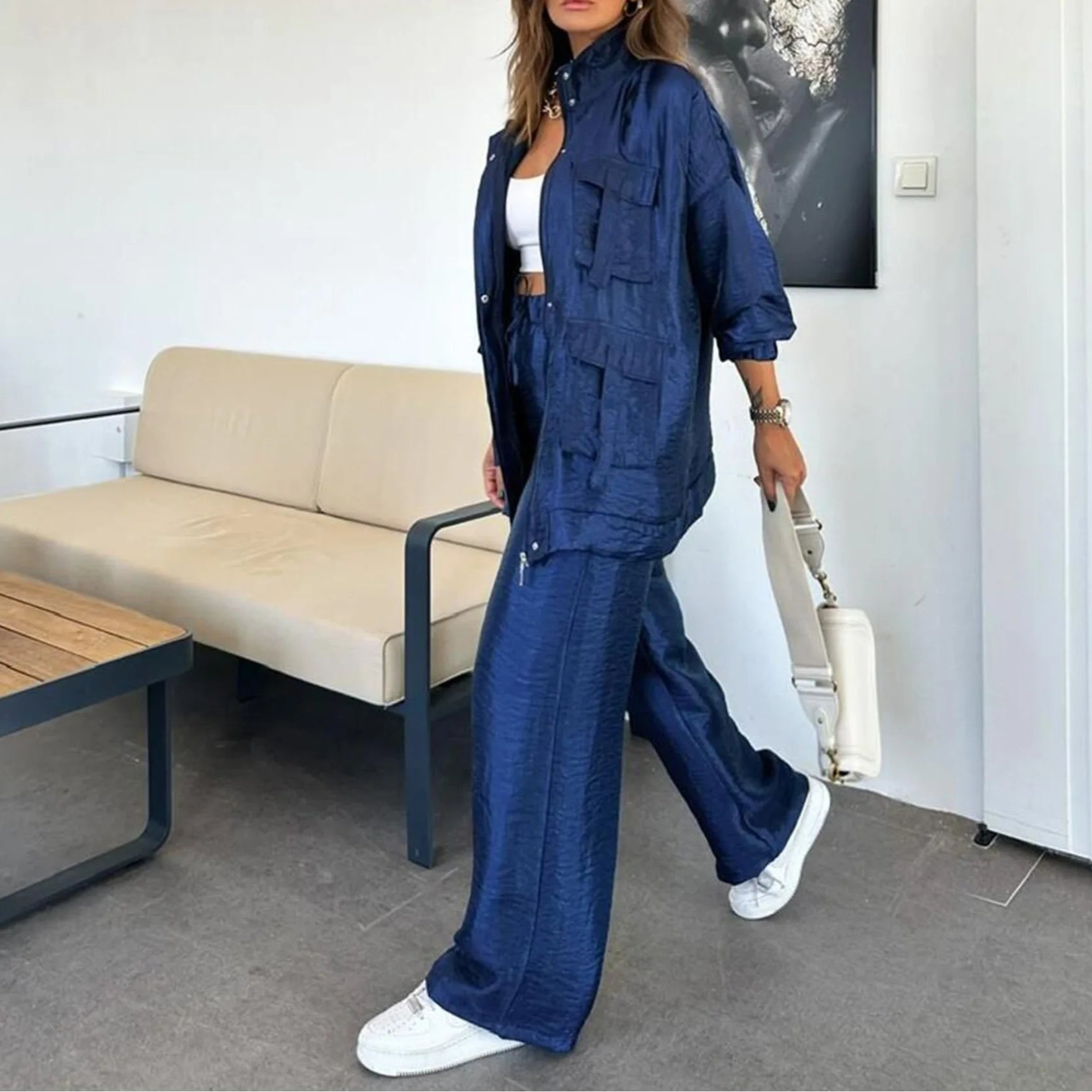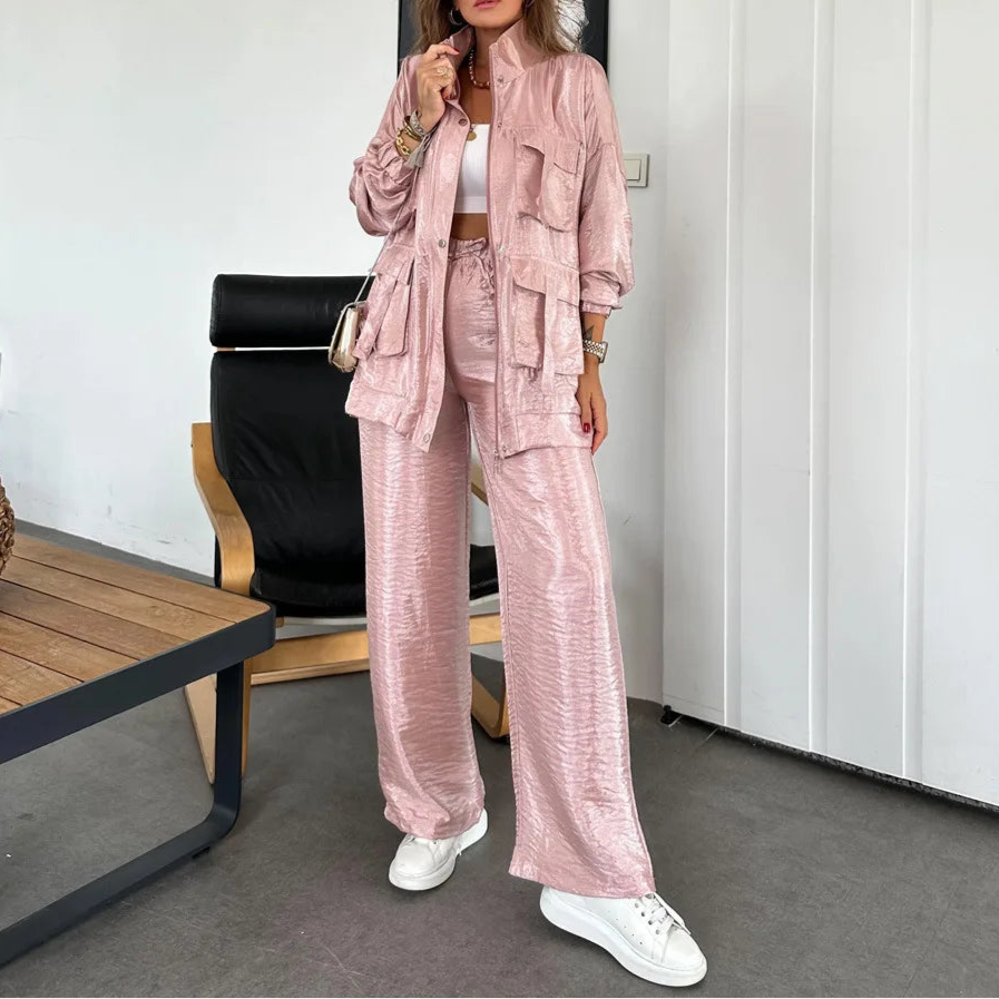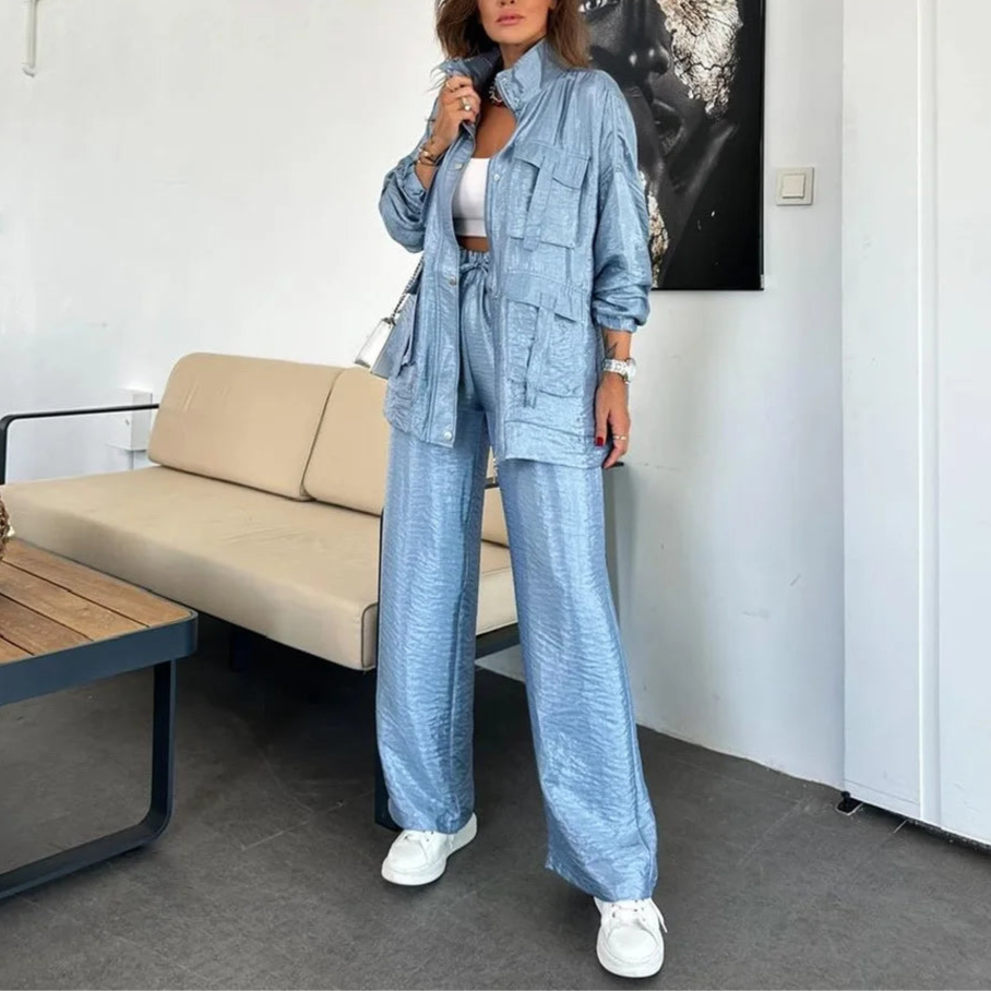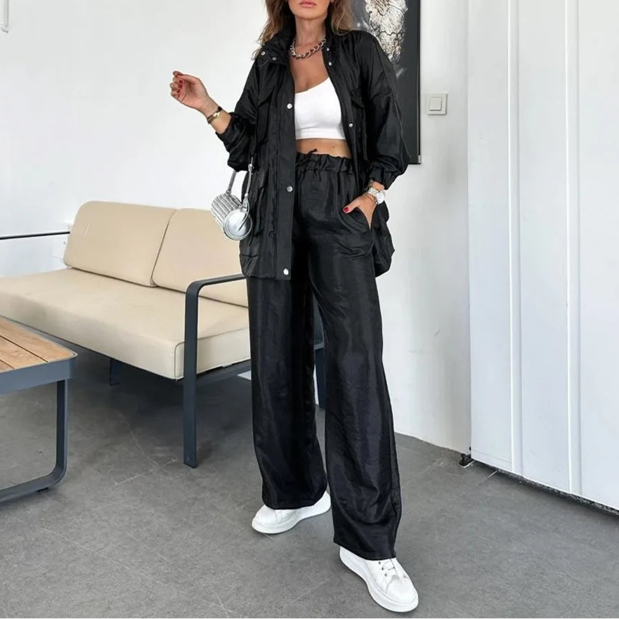 The Sorella™ Stylish Cargo Set is the ultimate blend of practical utility and modern elegance, designed to make you feel effortlessly stylish. The lightweight fabric drapes beautifully, offering a smooth, breathable feel that keeps you comfortable throughout the day. The cargo-style jacket features multiple oversized pockets, adding both a fashionable and functional element to your outfit, while the wide-leg trousers provide a relaxed yet polished look.